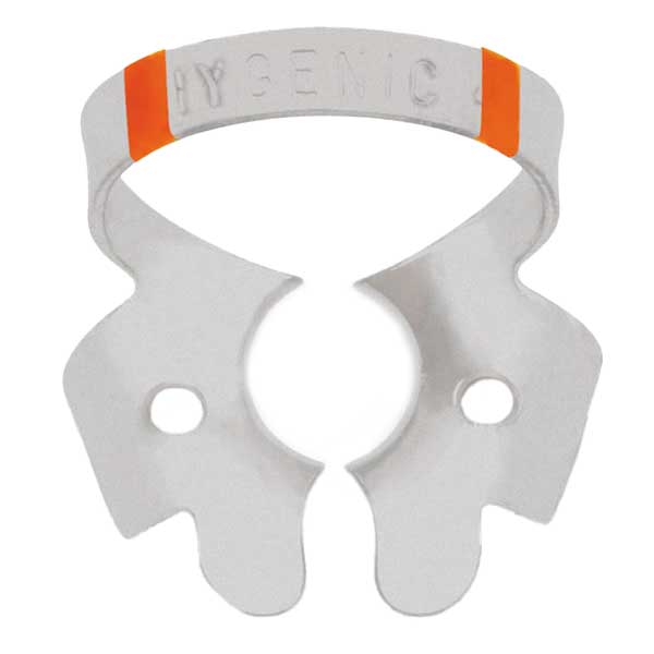 Hygenic Fiesta kofferdamklamme med vinger, farvekodet, mat finish, nr. 4, til mælkemolarer i overmunden, orange.