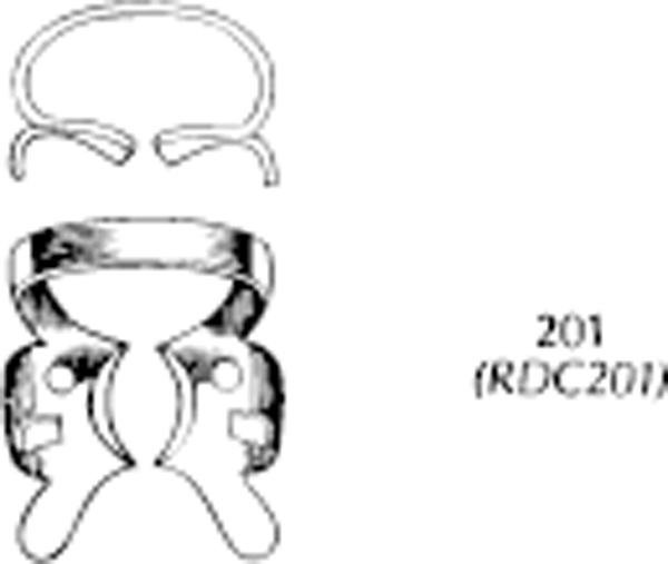 Kofferdamklamme med vinger, Satin Steel Alloy (blank), RDCM 201, med let festede kæber til molarer i OK.