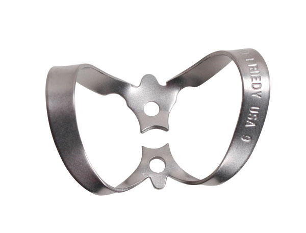 Kofferdamklamme med vinger, "sommerfugleklamme", Satin Steel Alloy (blank), RDCM 9, med forskudte kæber og stiv bue til incisiver.