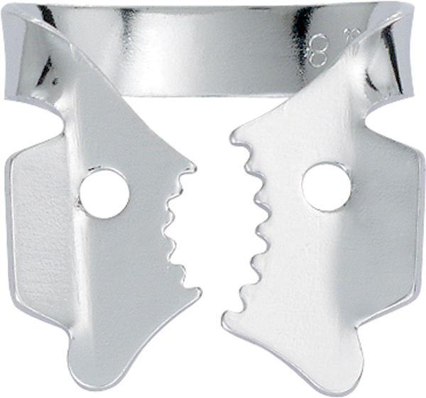 Kofferdamklamme med "takker", 12A, til OK-molarer i venstre side.