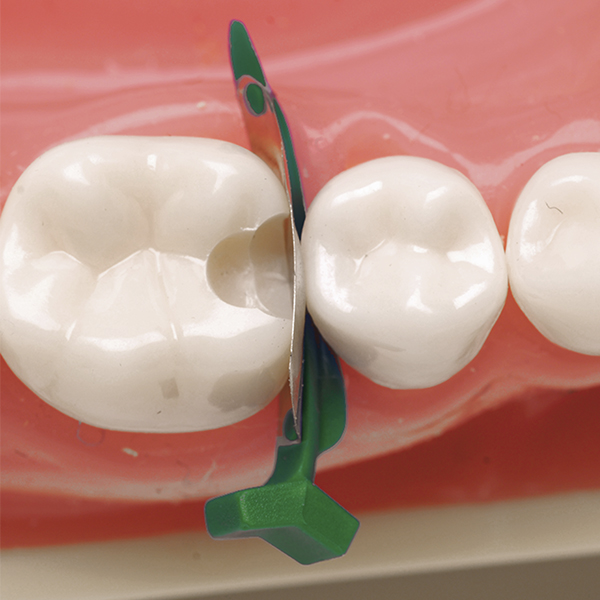 Kombination af kile og sektionsmatrice, appliceres som en almindelig kile, kilekonstruktion med fleksibel vinge, som kan tilpasse sig de fleste approksimalrum, venstre regular (mørkegrøn), refill.