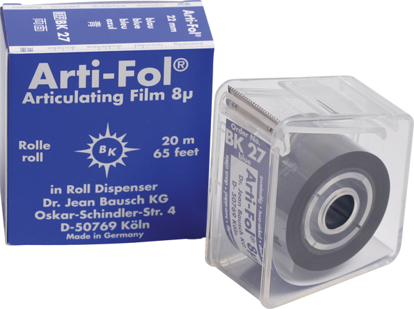 Okklusions-/artikulationskontrol, folie, blå, med farve på begge sider.