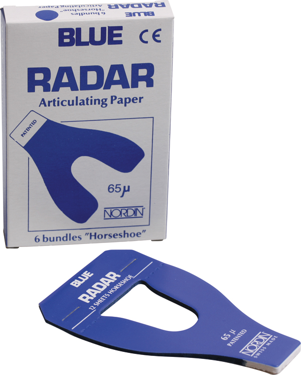 Papir til okklusions-/artikulationskontrol, hesteskoformet, blå, 65 my. Papiret er dobbeltsidet, dvs. afgiver farve på begge sider.