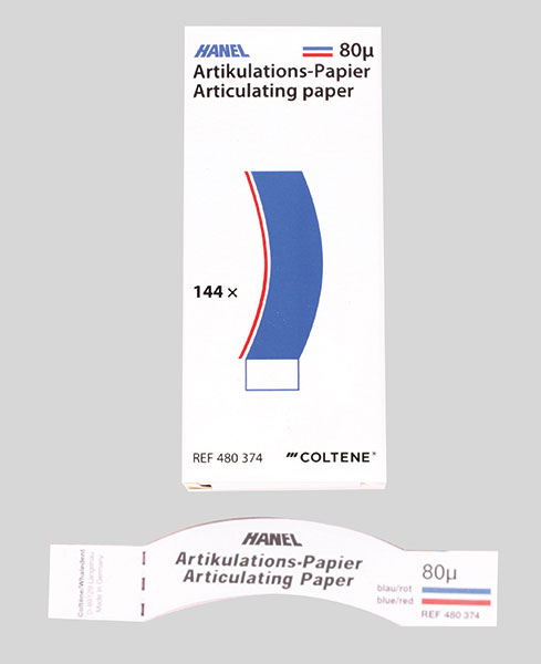 Papir til okklusions-/artikulationskontrol, blå/rød, buet, 80 my. Papiret er dobbeltsidet, dvs. afgiver farve på begge sider.