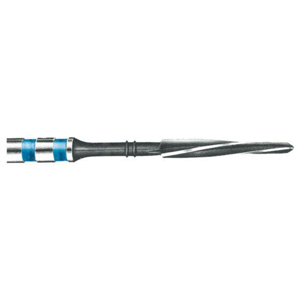 Kalibreringsbor til Unimetric 1,0, system med koniske rodstifter i titanium og tilhørender rodbor, med ikke skærende retentionsgevind og flads retentionshoved, anvendes til cementering i rodkanal til retention af opbygningsmateriale. Bor i str. 110 med blå markering.