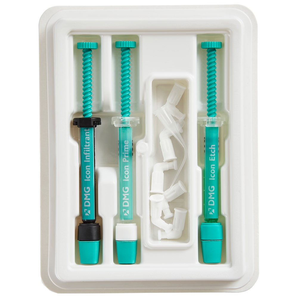 Sæt til behandling af 2-3 læsioner: 1 sprøjte á 0,45 ml Icon Etch, 1 sprøjte á 0,45 ml Icon Prime, 1 sprøjte á 0,45 ml Icon Infiltrant, 6 Vestibular-Tips og 1 Luer-Lock-Tip.