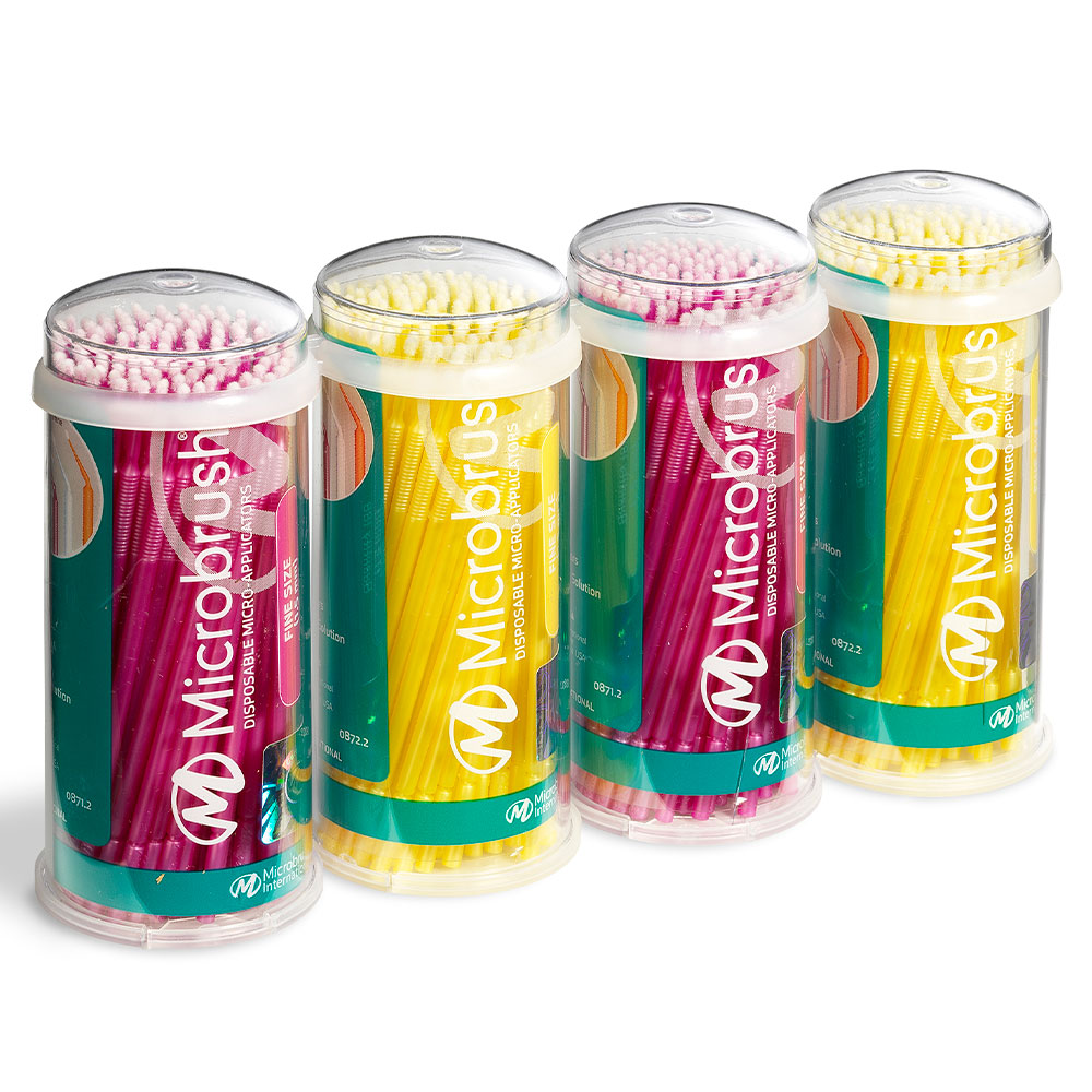 Applikatorer til præcis applicering af syregel, primer, bond mm, fine (1,5 mm), lyserød og gul, i rør. OBS: Røret passer IKKE til Microbrush Plus dispenser.