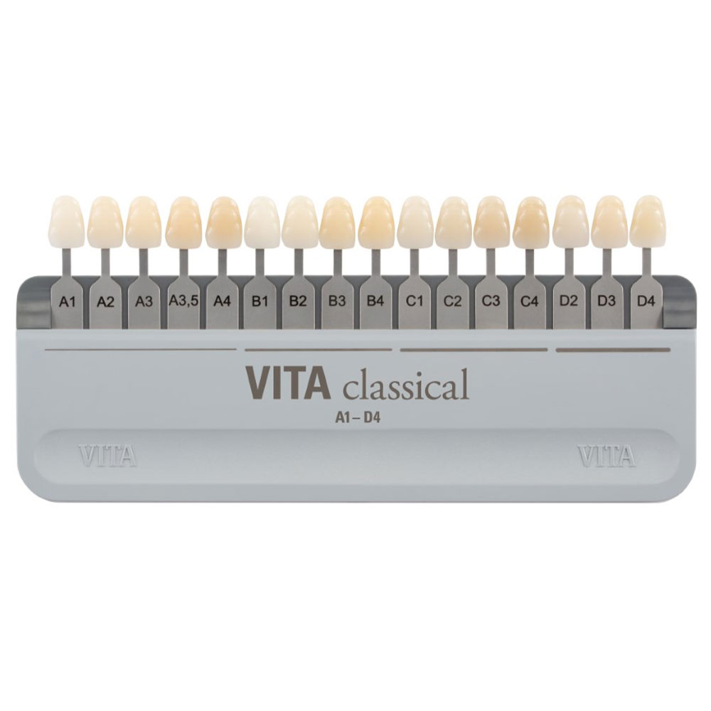 Farveskala med 16 Vitafarver (A1-D4), til farvebestemmelse ved fyldnings- og kroneterapi.