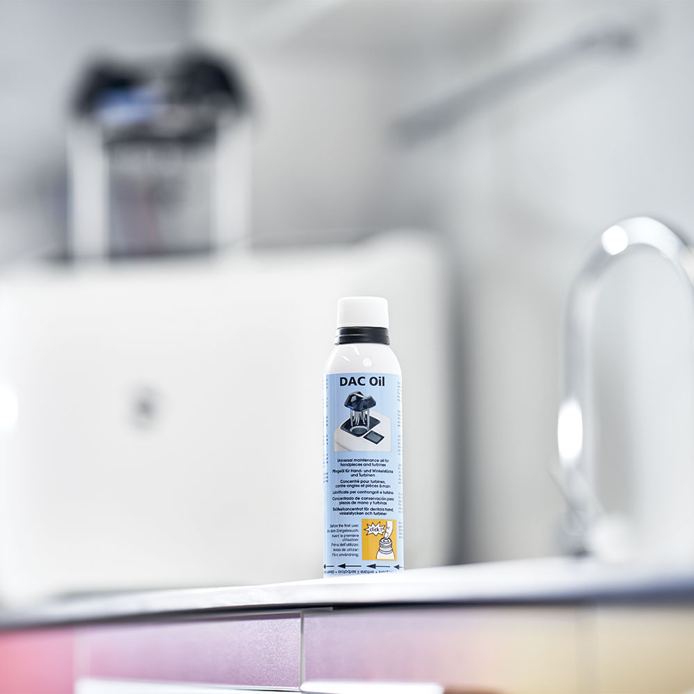 Plejeolie til smøring og pleje af vinkelstykker og turbiner, anvendes i DAC Universal med serienr. højere end 14000, med blå knapper og blåt display, samt til DAC Universal S.