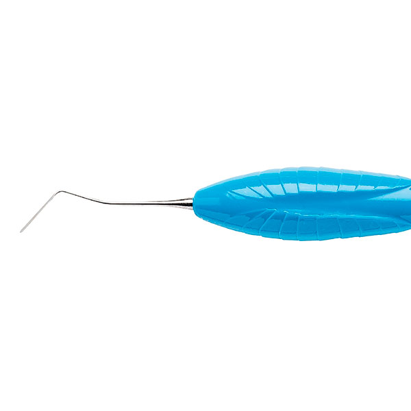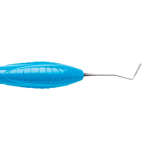 Tynd og smal spatelformet instrument med vinklede ender til modellering af komposit i vanskelig tilgængelige områder såsom approksimale vægge eller lignende, blå, ErgoSense silikonegreb.