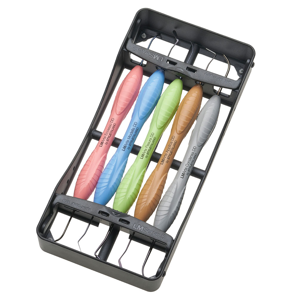 Sæt med LM Arte instrumenter til kompositfyldninger, alle belagt med non-stick LM Dark Diamond belægning, med ErgoSense silikonegreb, ligger i en LM Servo-5 kassette.