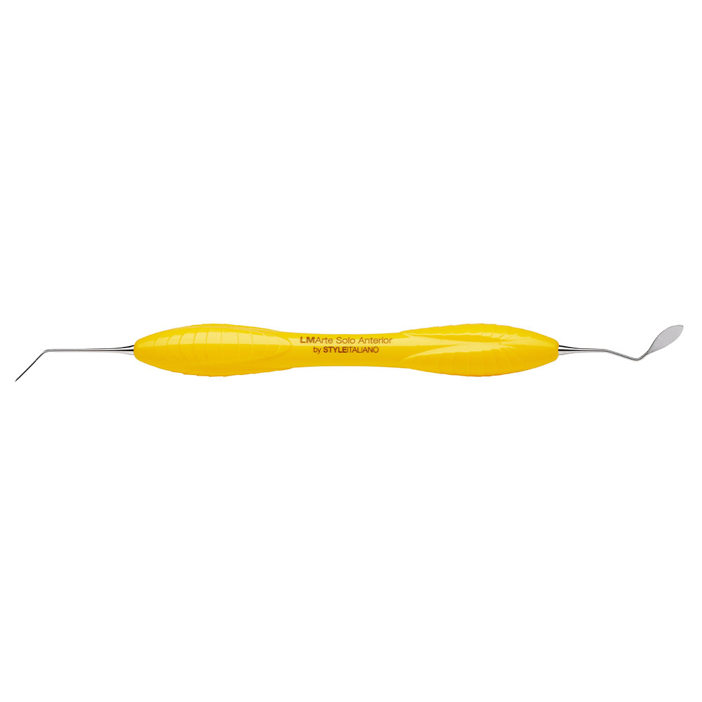 Spatelformet instrument til facade-restaureringer, med en smal, spids spatel i den ene ende og en bred, afrundet spatel i den anden ende, til modellering af fortænder, specielt til den labiale forside/facade, gul, ErgoSense silikonegreb.