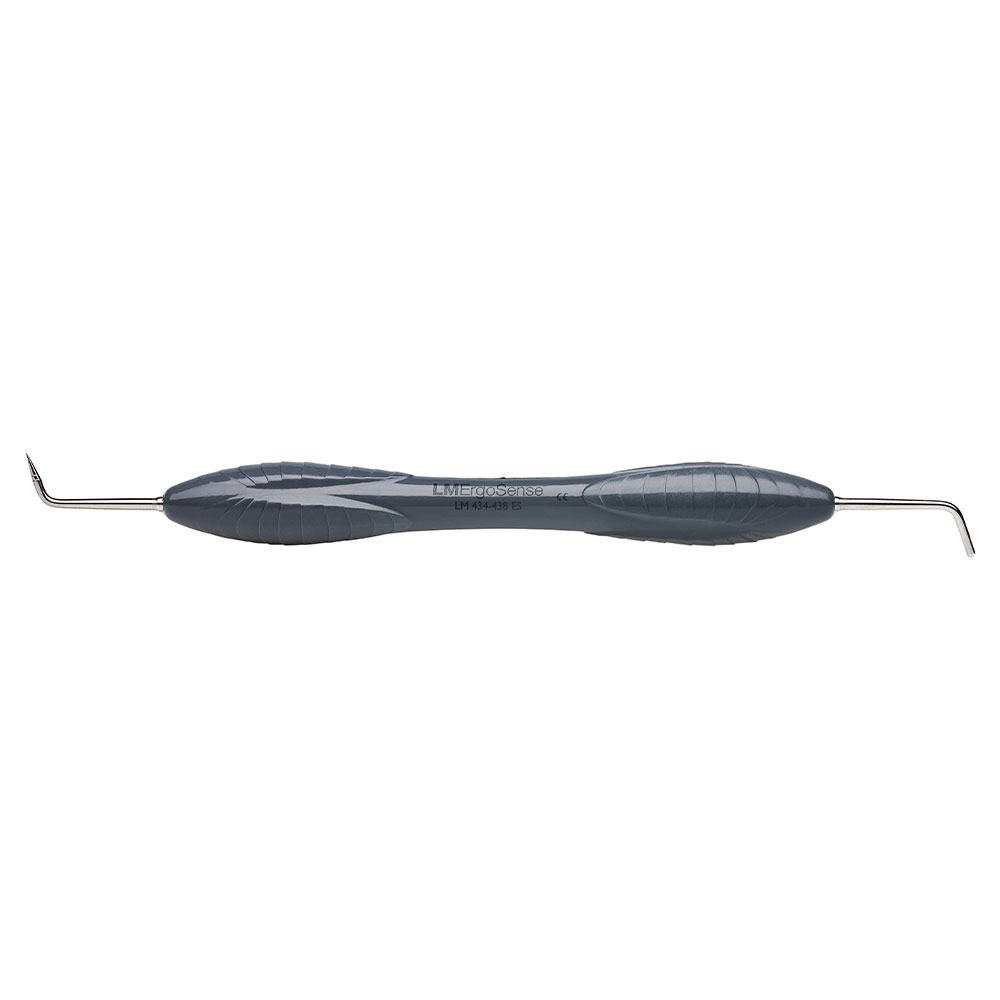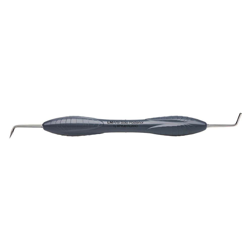 Instrument til posteriore komposit restaureringer, med en stopper med flad ende til brug med bulk fill og kompositmaterialer i den ene ende og en konisk modelleringsspids med skarp spids til konturering af det okklusale relief i den anden ende, sort, ErgoSense silikonegreb.