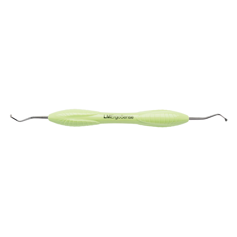 Back Action ekskavator, triple-bukket, rund, diameter 2,0 mm, anvendes til ekskavering og fjernelse af tandsten på vanskeligt tilgængelige steder, fjernelse af granulationsvæv ved retrograd rodyldning, laporation eller ekstraktion samt depuration af konkave rodfyldninger og furkaturer, 651-661 ES, lysegrøn, ErgoSense silikonegreb.
