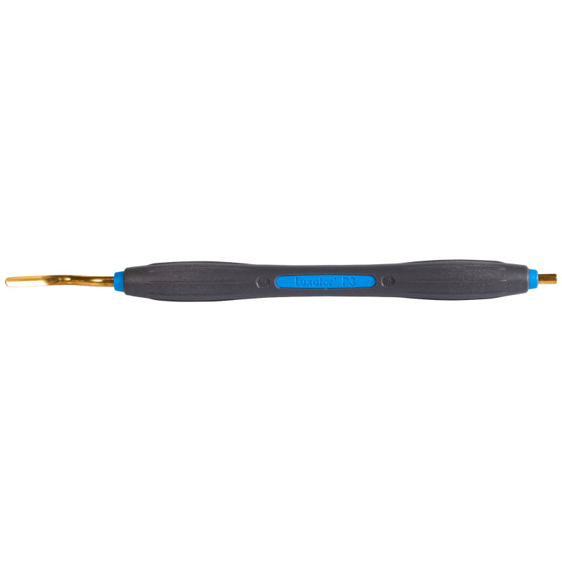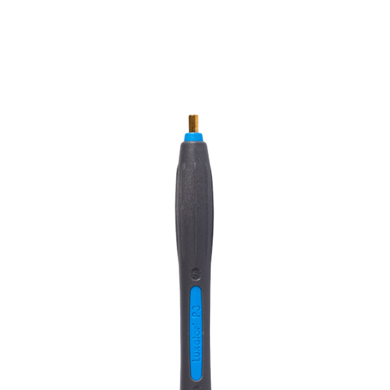 Titaniumbelagt luxator, der er tyndere og skarpere end tilsvarende i rustfrit stål, har pennegreb, hvilket giver øget taktil føling, bedre indsyn og kontrol, P-3 kontravinkelbøjet, mørkeblå.