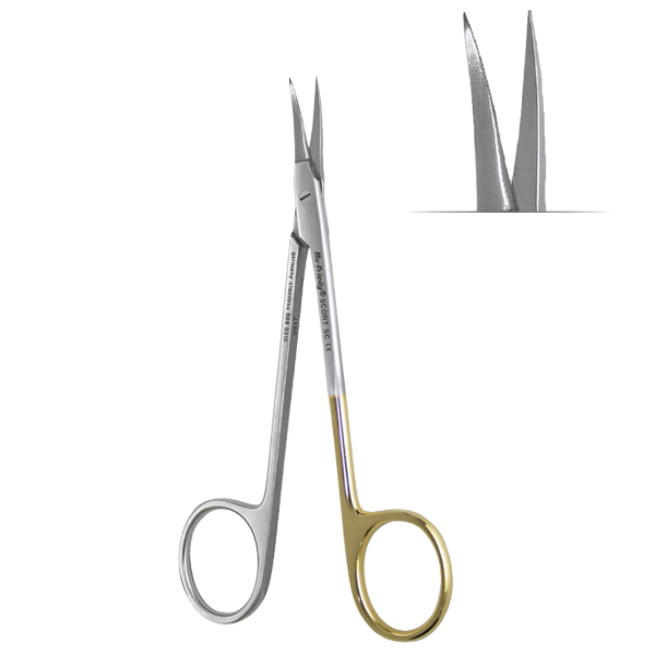Saks til trimning af væv samt til sutur, med Super-Cut skær, hvilket betyder at skærene er meget skarpe og at det ene skær har små takker, der holder på vævet eller suturen, så det ikke smutter ud af grebet, buet, 12 cm.