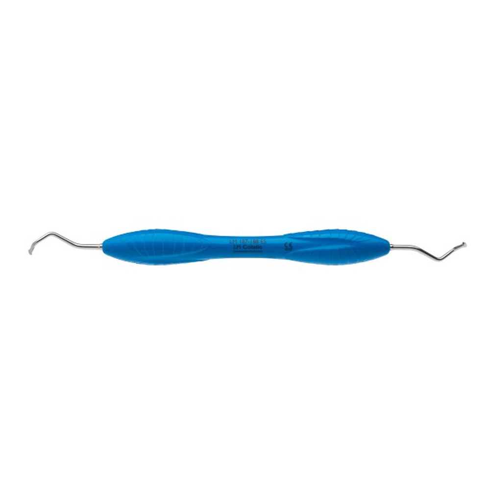 LM håndinstrument fra LM Periodontal Surgery systemet, et avanceret sæt håndinstrumenter designet til periodontale mikrokirurgiske procedurer. LM Coltello, 187-188 ES, Microsurgical Knife, er en mikroskopisk kniv, der kombinerer incisions- og elevationsrmuligheder i områder uden direkte adgang. En skarp spids muliggør præcis kontakt med den underliggende knogle. Skaftets fasthed muliggør brugen af det tryk, der er nødvendigt for at hæve bløddelsmarginerne. Skaftets vinkler og en lille arbejdende del med en kant giver adgang til svært tilgængelige områder. Blad med stor skærekraft. Skarpe og små spejlvendte arbejdende dele er nyttige til at løfte og adskille periost fra knoglen. Blå, ErgoSense silikonegreb.