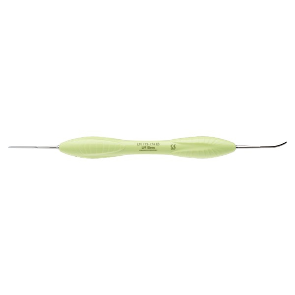 LM håndinstrument fra LM Periodontal Surgery systemet, et avanceret sæt håndinstrumenter designet til periodontale mikrokirurgiske procedurer. LM Eleva, 173-174 ES, Micro Periosteal Elevator, er en en mikroskopisk periosteal elevator til adskillelse af væv. Præcis og let afskåret spidskant for effektiv separation af periost fra knoglevævet. Fraværet af skærkanter forhindrer uønsket skade på blødt væv. En buet og en lige arbejdende del letter adgang til forskellige områder. Skaftvinkling muliggør mere apikal adgang, hvis det er nødvendigt. Lysegrønt, ErgoSense silikonegreb. Anvendes som Step 2.
