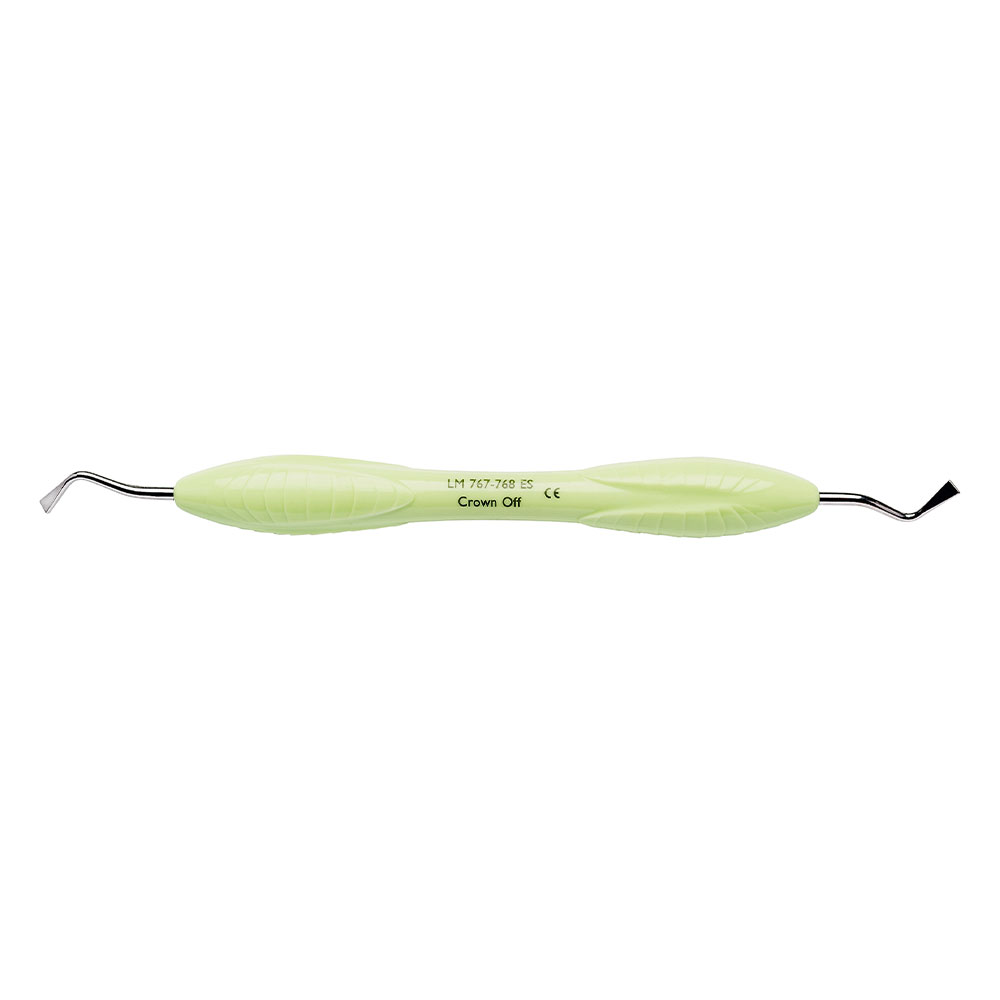 Kronefjerner, Crown Off, til fjernelse af kroner, broer og midlertidige provisorier, den arbejdende del er vinklet 45 grader, hvilket forhøjer instrumentets rækkevidde, anvendes ved at skære en slids i kronen fra gingivakanten og op okklusalt, lime- grøn, med ErgoSense silikonegreb.