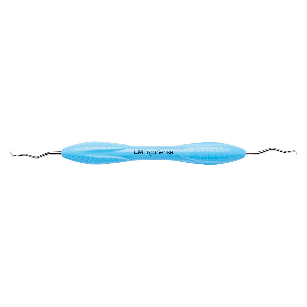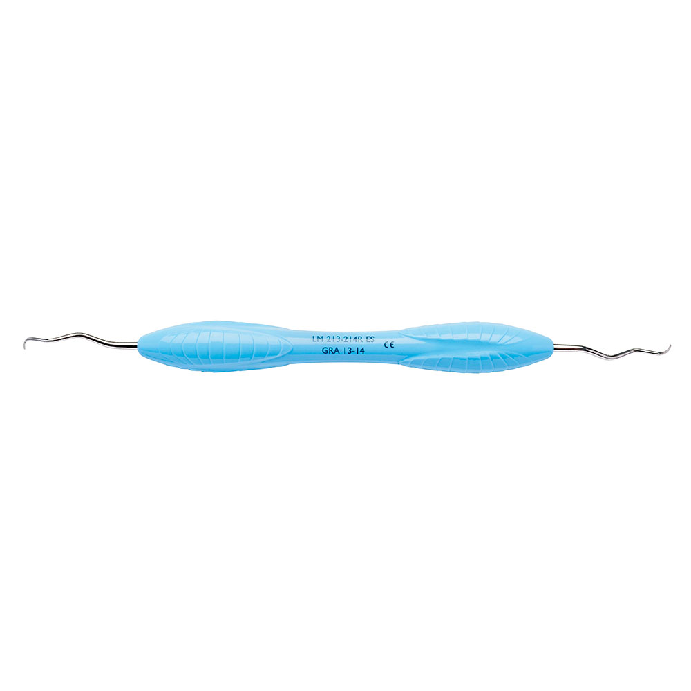 Curette, 213-214R, Gracey rigid, har tykkere og mere stift blad og den arbejdende del er lidt bredere, 13/14, til præmolarer og molarer, mesiale overflader, lyseblå, ErgoSense silikonegreb.