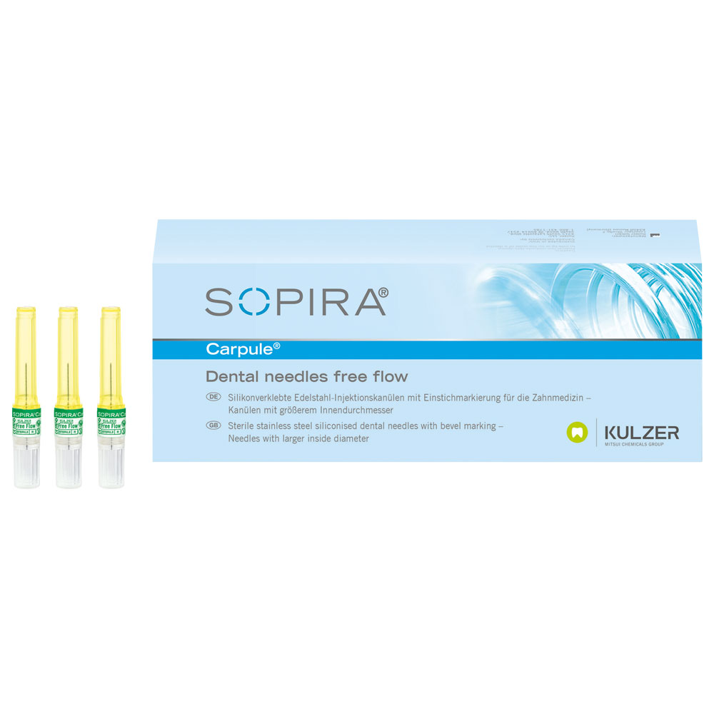 Sopira Free Flow injektionskanyler med tyndere væg, med markering af facetslebet skærekant, overfladecoated, 30G, 0,3 x 16 mm, transparent gevind, med gul hætte og grøn mærkat.