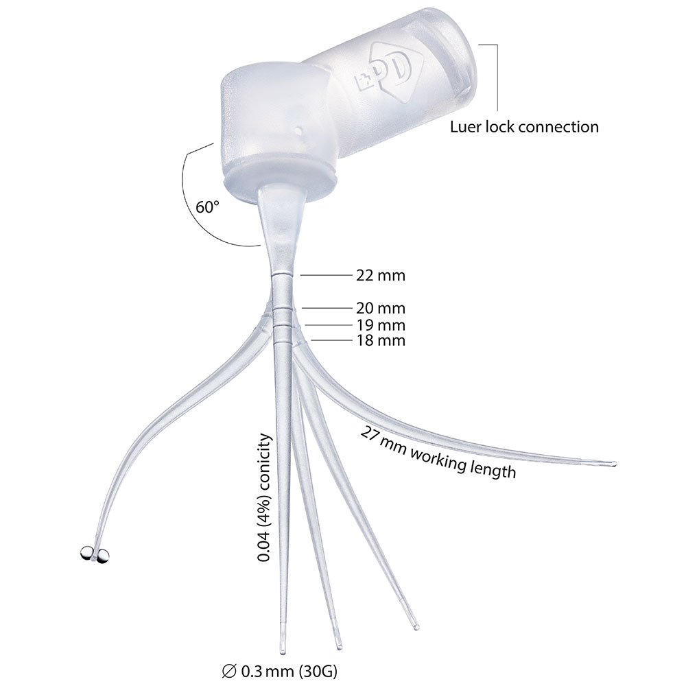 Tynde, transparente plastkanyler i fleksibel polypropylen til rodskylning, tilpasser sig rodkanalens anatomi og skyller selv kurvede kanaler via de to laterale åbninger nær apex, 30G, 4% taper, længde 27 mm med dybdemarkering ved 18, 19, 20 og 22 mm, luer-lock-fatning. Er ikke sterile, men fremstillet i et ISO-renrum med høj kontrol af luftforholdene, inden de hurtigt enkeltpakkes. Kan ikke autoklaveres.