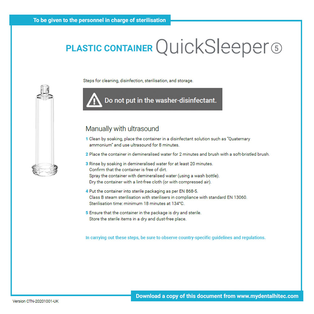 Plastbeholdere til SleeperOne 4 automatisk injektionssprøjte. Må ikke vaskes i opvaskemaskine, men kan autoklaveres ved 134 grader.