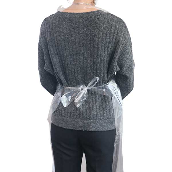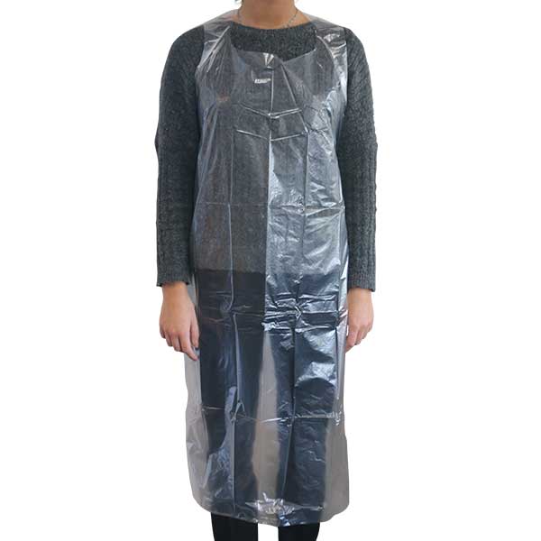 Engangsforklæder med nakkestrop og bindebånd i taljen, transparent, polyethylen plast (LDPE), 25 my, 125 x 81 cm, i dispenserboks som passer i en vægmonteret holder.