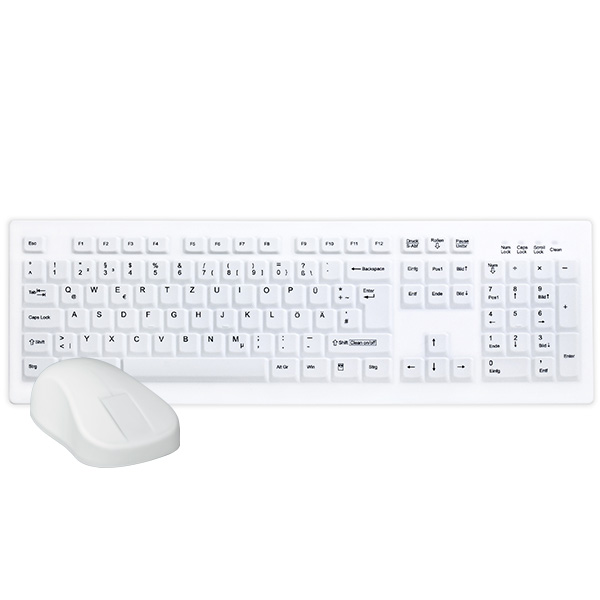 Trådløst og desinficerbart tastatur og mus, tåler en lang række rengørings- og overfladedesinfektionsmidler, herunder produkter indeholdende alkohol.. Silikoneovertrækket til tastaturet kan tåle autoklavering op til 140 grader, mål ca. 449 x 142 x 26 mm. Indpakning i autoklavepose ved autoklavering er unødvendig.