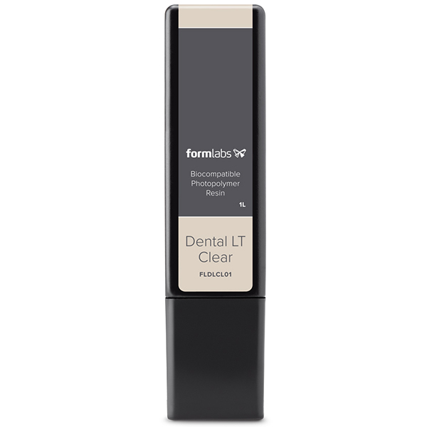 Biocompatible Photopolymer Resin til Formlabs Form 2 3D printer, Dental LT Clear Resin, til fremstilling af digitalt designede skinner, retainers og orthodontisk apparatur, har høj brudstyrk og kan poleres op til meget høj transparens.