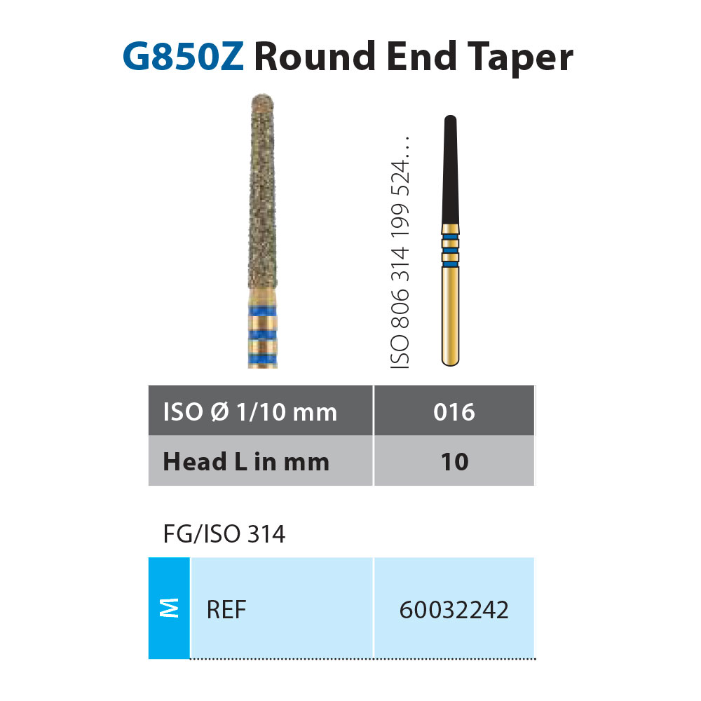 Diamant, Z-Rex, med patenteret ERA-bond for speciel kraftig indlejring af diamantkornene og forøget hårdhed af diamanternes metallegering. Til Crown Cutting, til FG, konisk med afrundet top med 3 blå ringe, længde på den arbejdende del 10 mm. ZR850/016.