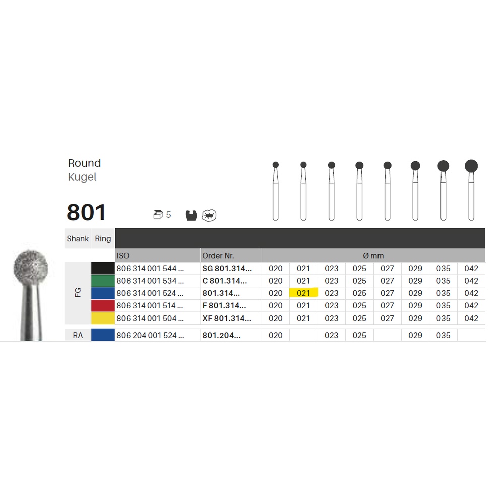 Til præparation, til FG, rund, medium med blå ring, hovedlængde 2,1 mm, 001/021 M (801).