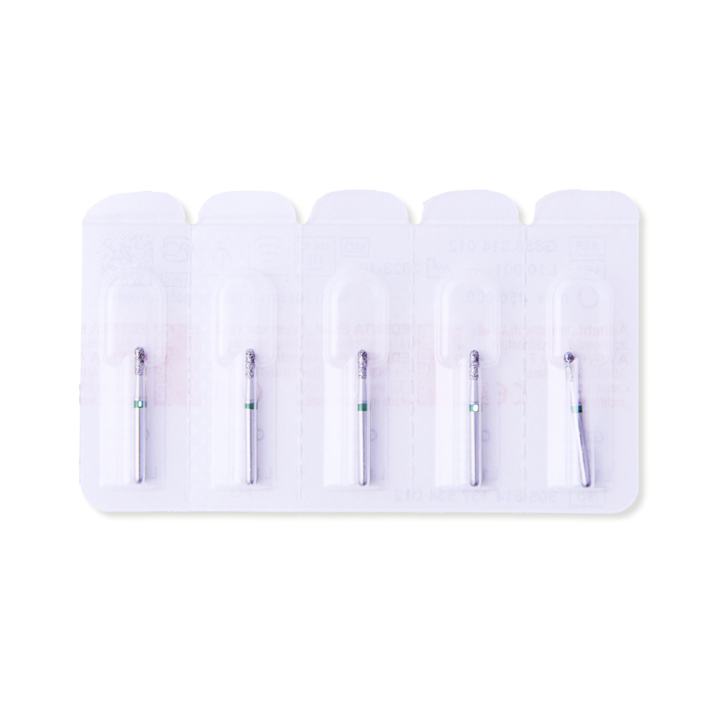 Diamantbor til præparation, til FG, cylinderformet med afrundet top, grov med grøn ring, tykkelse 012, længde på hoved 4 mm.