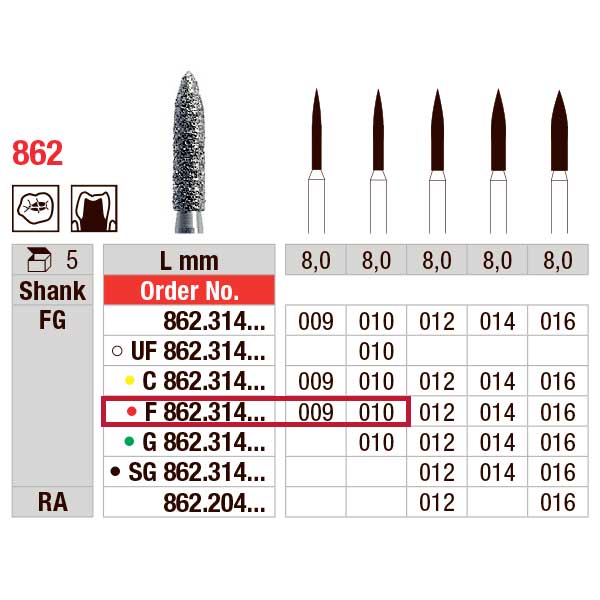Diamantbor til FG, fin med rød ring, 010, flammeformet, hovedlængde 8 mm.