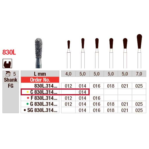 Diamantbor til pusning, til FG, C830L/014 pæreformet lang, super fin med gul farvemarkering, længde på hovedet 5,0 mm.