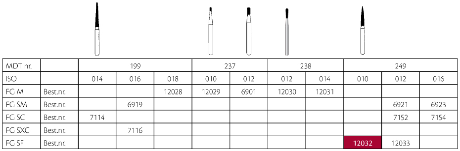 Diamantbor til pudsning, flammeformet, til FG, short fin med rød ring, 249/010SF, længde på hovedet 8 mm.