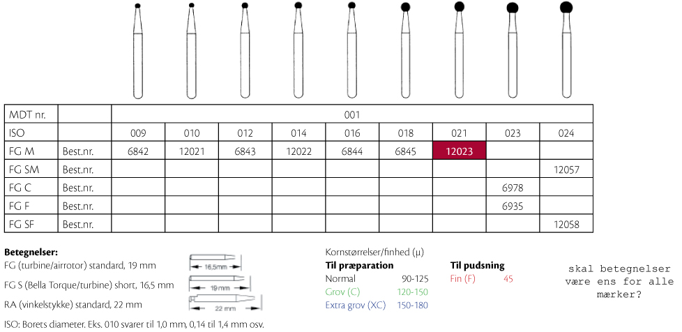 Diamantbor til præparation, rund, til FG, medium med blå ring, 001/021 M, længde på hovedet 2,1 mm.