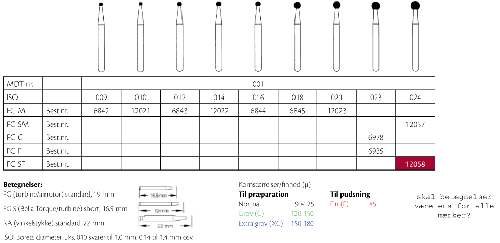 Diamantbor til pudsning, rund, til FG, short fin med rød ring, 001/024 SF, længde på hovedet 2,4 mm.