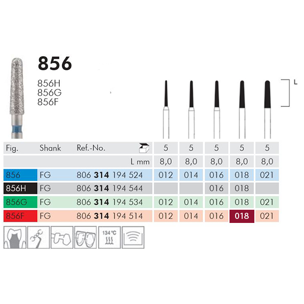 Diamantbor til pudsning, til FG, fin med rød ring, 856F/01, konisk med afrundet top, længde på hovedet 8 mm.