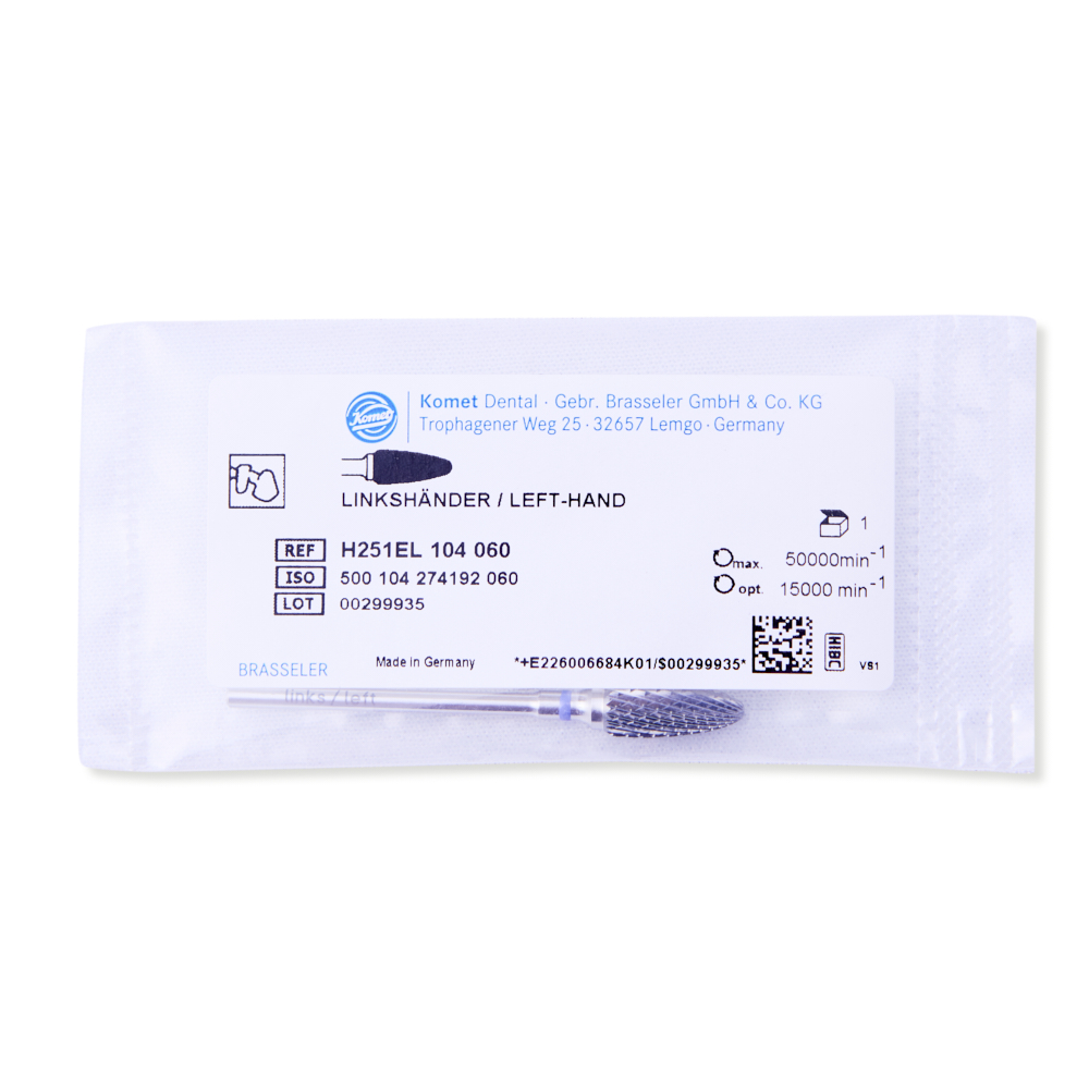 Komet knopformet hårdmetalfræser med forskudt skær. Violet ringmarkering til venstre hånds håndstykke, til HP. Længde arbejdende del 14 mm. H251EL.104.060.