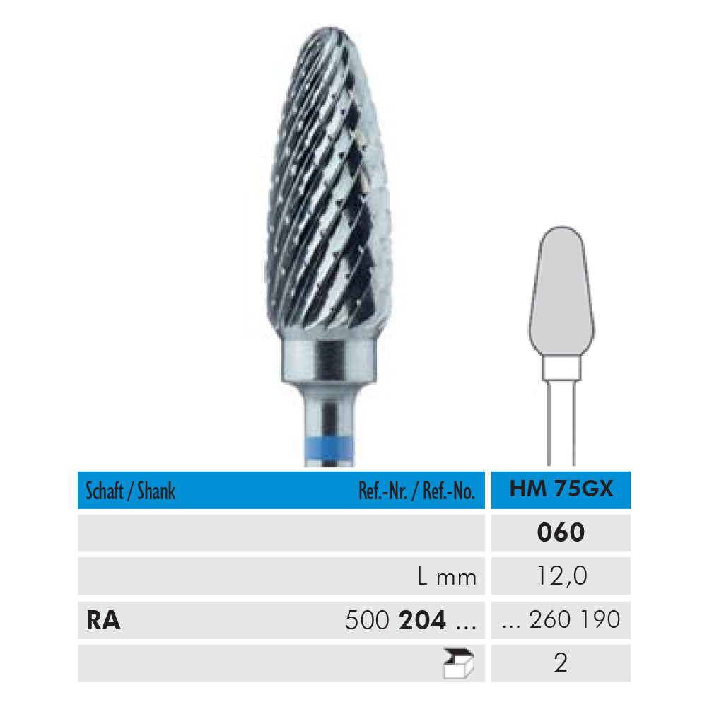 Fræser til trimning af ikke-ædelt metal samt akryl, til RA, 75GX, fræser m. tværhug, m. blå ring, str. 060, hovedlængde 12 mm, kegle-/knopformet med afrundet top.