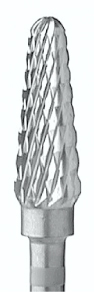 Fræser i hårdmetal til trimning af ikke-ædelt metal og akryl, til RA, 79GX, fræser m. krydsskær, m. blå ring, str. 040, hovedlængde 14,2 mm, kegleformet med bred afrundet top.