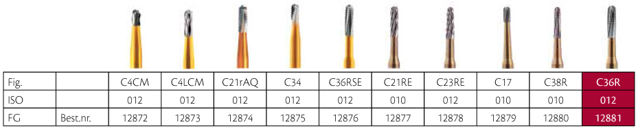 Skrubfræser med højpræcisions-skær, velegnede til at skære i ædle og uædle metaller, med gyldent skaft, til FG, C36R/012, længde på hoved 4,3 mm.