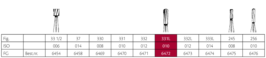 Hårdmetalbor til præparation, til FG, 331L/010, lang pæreformet, hovedhøjde 4,1 mm.