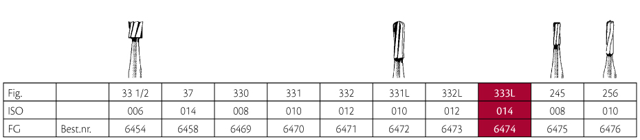 Hårdmetalbor til præparation, til FG, 333L/014, lang pæreformet, hovedhøjde 4,1 mm.