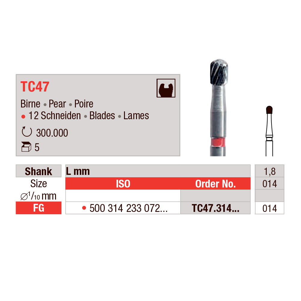 Finerbor til pudsning, hårdmetal, 12-bladede, til FG, pæreformet, med rød ring, str. 014, hovedlængde 1,8 mm.