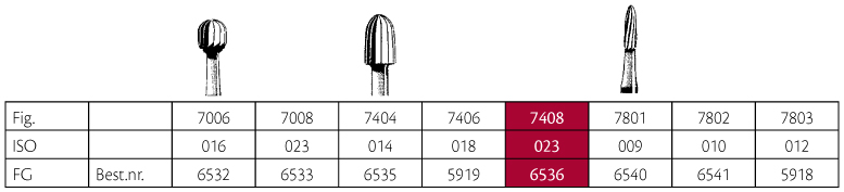 Hårdmetalbor til pudsning, guldfarvede, 12-bladede, til FG, æg-formet, 7408/023, hovedhøjde 3,6 mm.