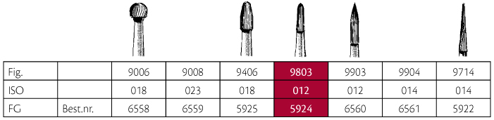 Hårdmetalbor til pudsning, guldfarvede, 30-bladede, til FG, flammeformet, 9803/012, hovedhøjde 2,9 mm.