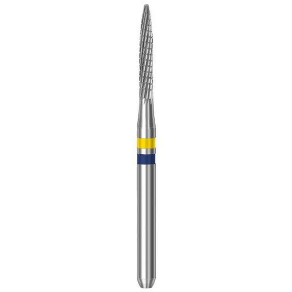 Q-hårdmetalfinerbor med 12 optimerede snoede skær med tværhug. Grundet de særlige skær bliver overfladen mere fin og glattere end efter pudsning med en fin diamant. Anvendes til konturering, pudsning og polering af komposit, til FG airrotor, flammeformet med spids top og gul/blå ringmarkering. Længde arbejdende del: 8 mm. H48LQ.314.012.