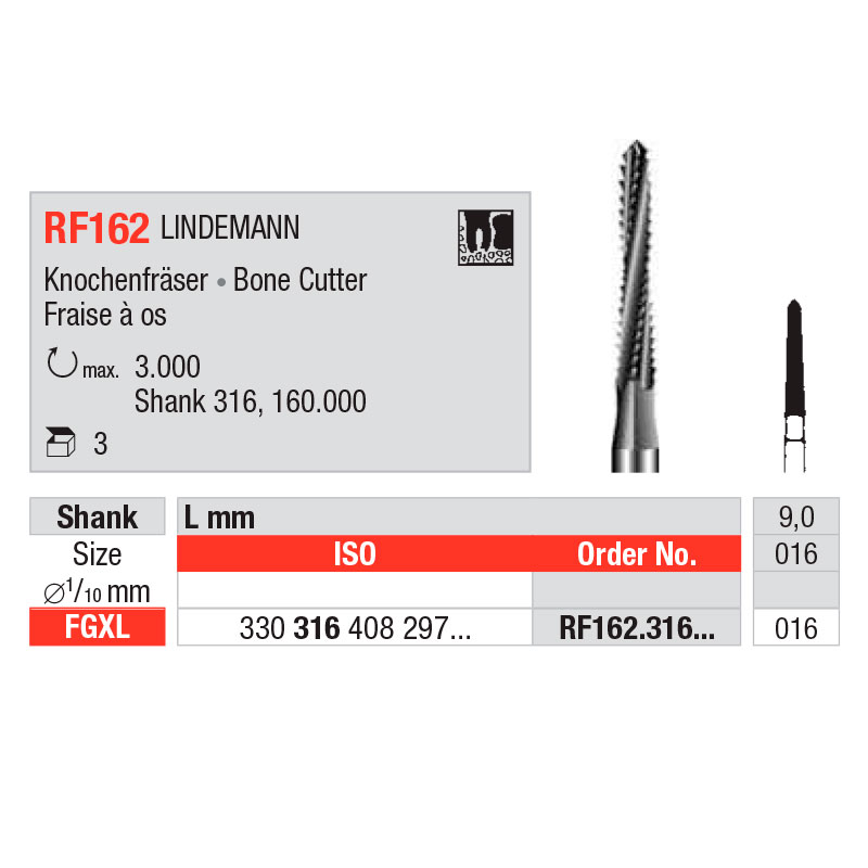 Knoglefræser i rustfrit stål, til FG, XL forlænget, str. 016, RF162, 1,6 mm x 9 mm.
